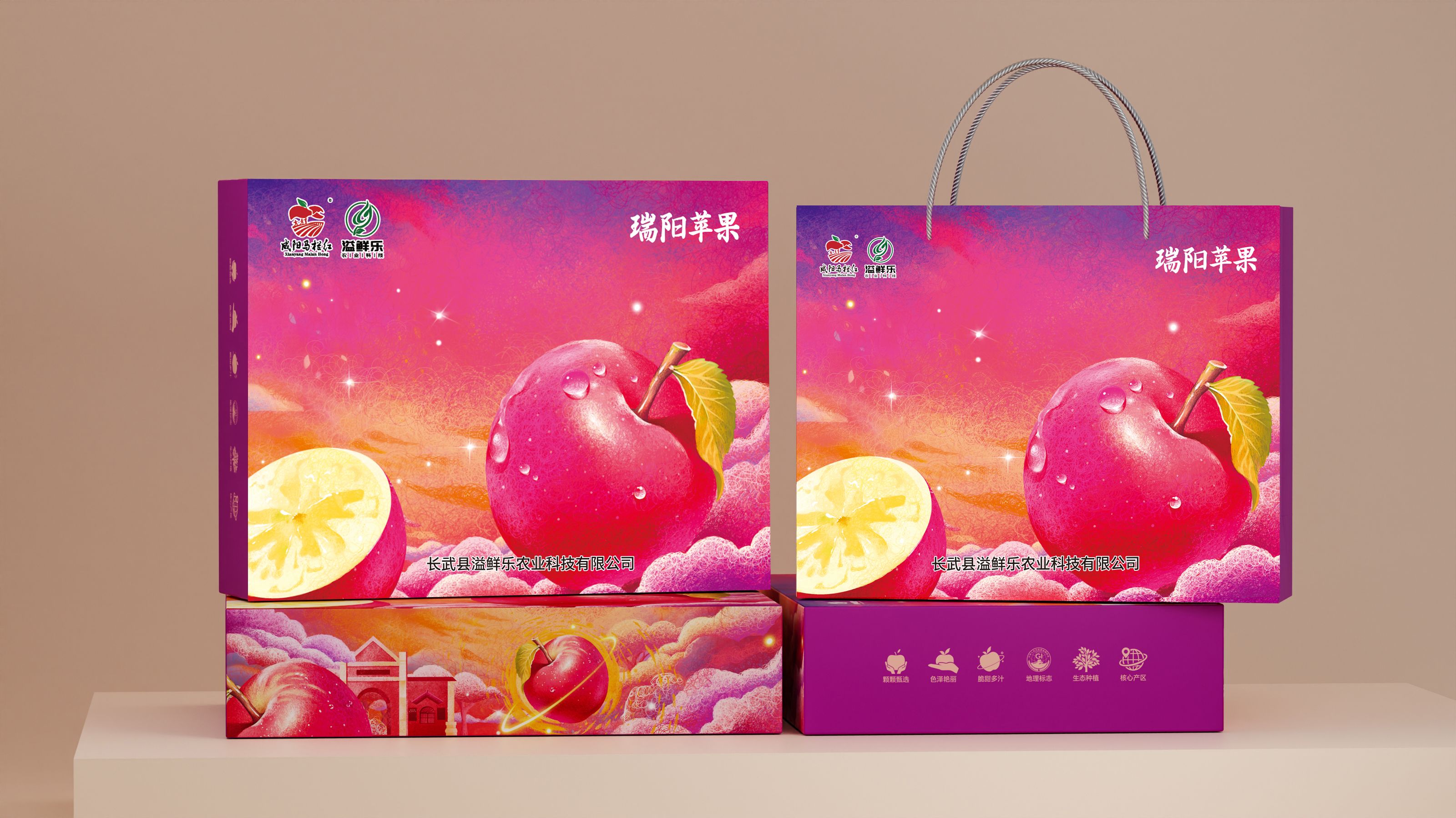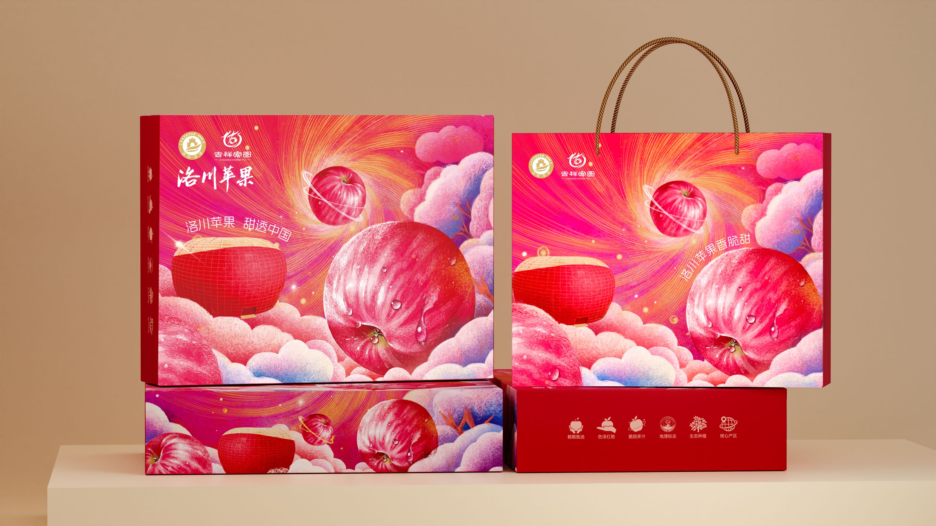 该设计以“洛川苹果·甜透中国”为核心,通过渐变粉橙色调与旋转星云纹理营造活力氛围,主视觉突出饱满水润的苹果形象,搭配传统灯笼元素与祥云纹,融合现代美学与文化底蕴。包装正面突出产品名与核心卖点“香脆甜”,底部标注品质认证图标,整体既彰显地域特色,又传递高端礼品属性,实现视觉吸引力与品牌价值的统一。