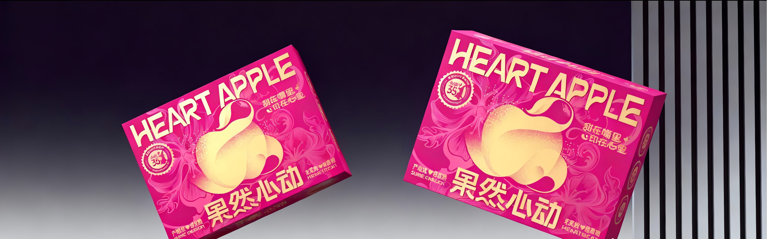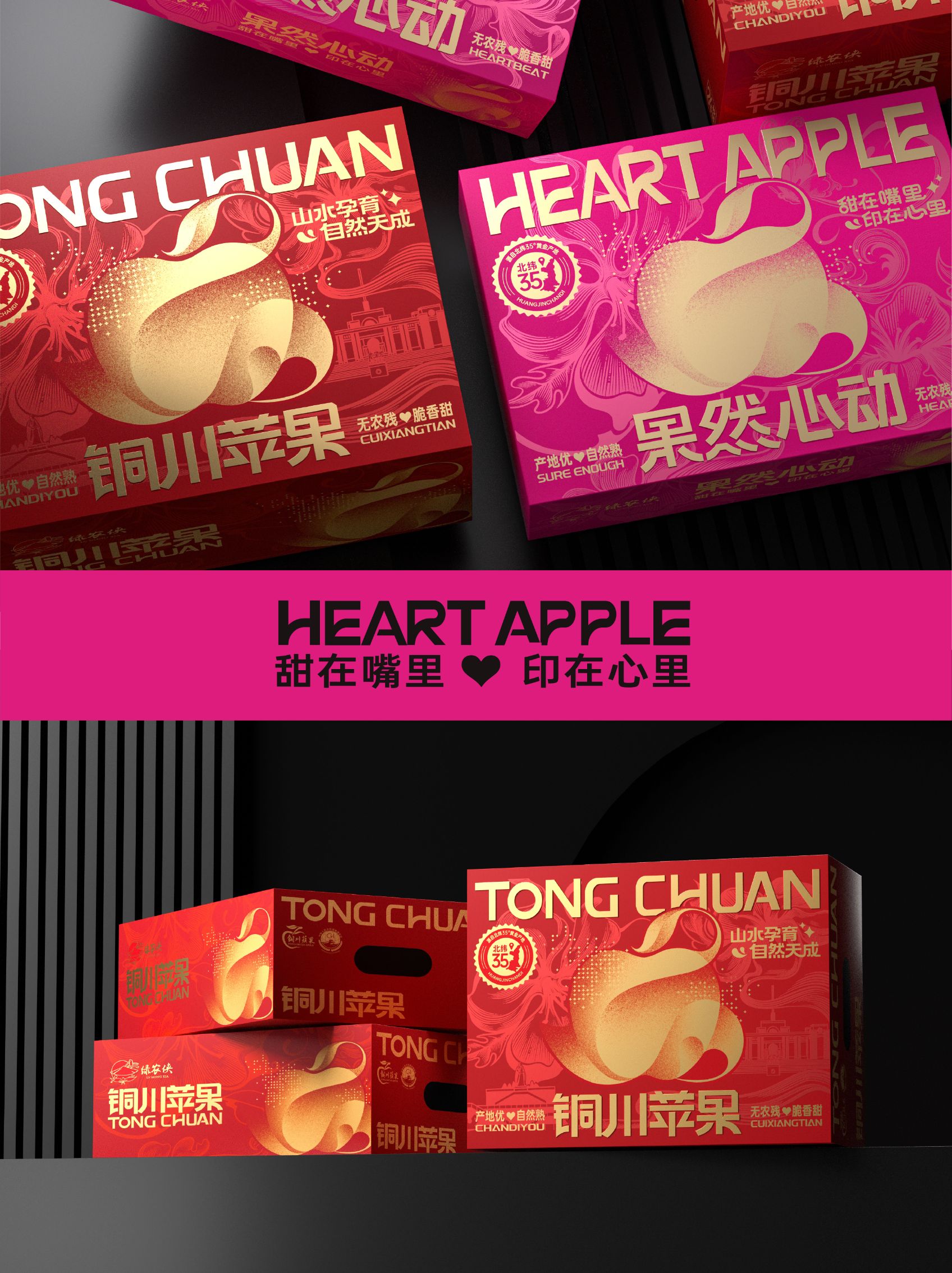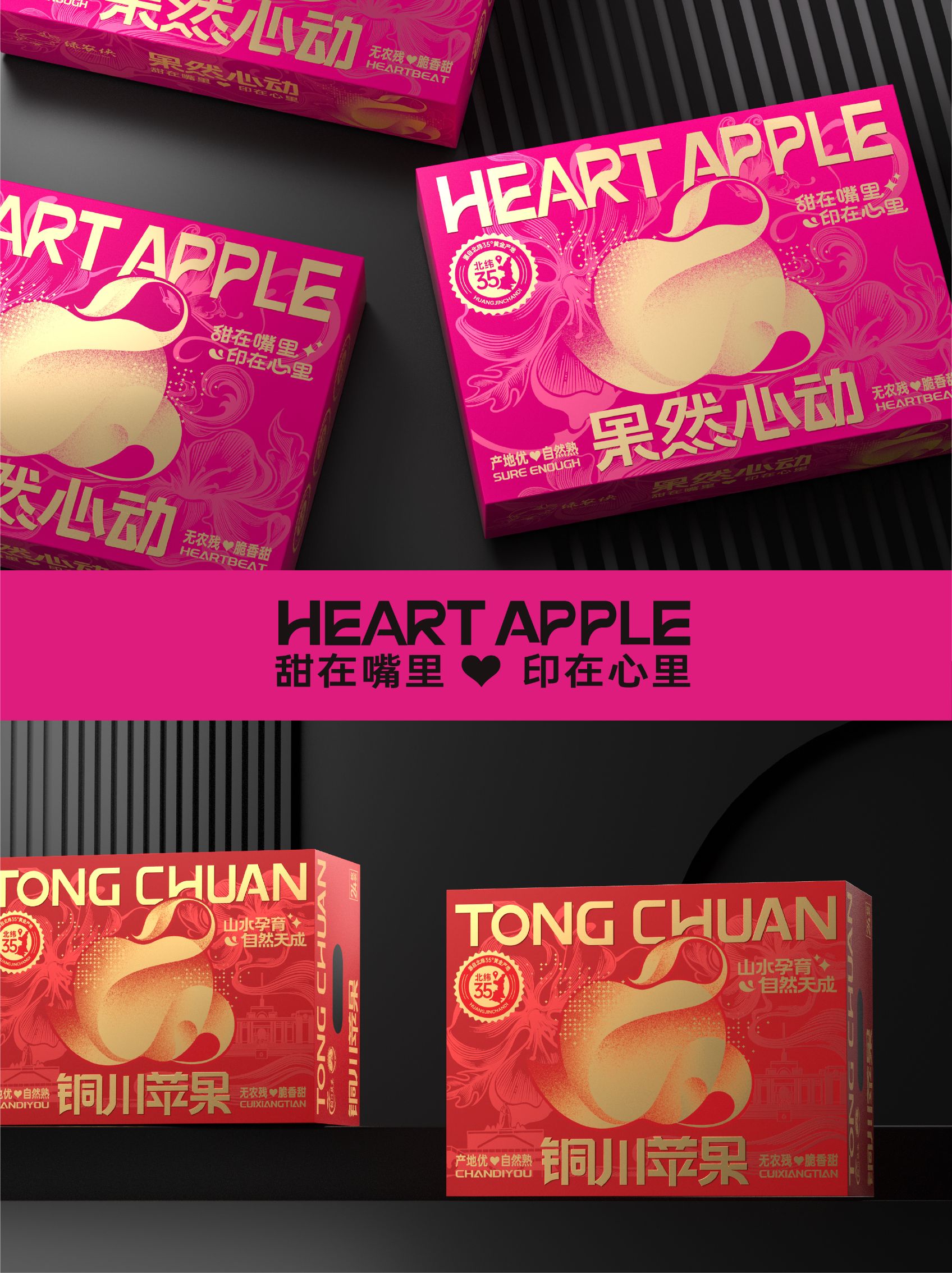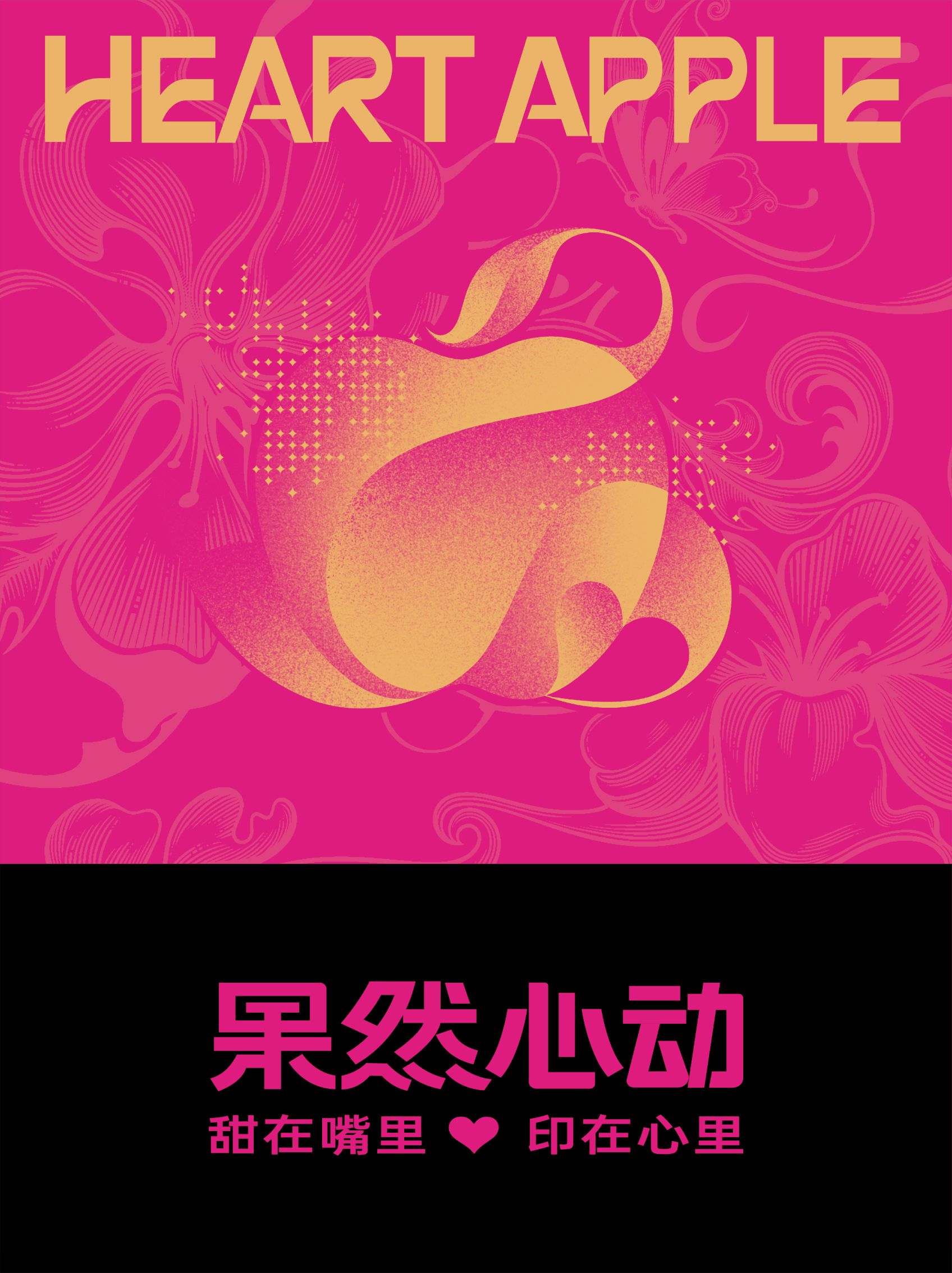 主题画面以粉色为主色调的 “果然心动” 苹果礼盒为主体,礼盒正面印有金色 “HEART APPLE” 英文和 “果然心动” 中文,搭配苹果花卉纹样与苹果抽象造形图案,整体呈现甜蜜浪漫的氛围。